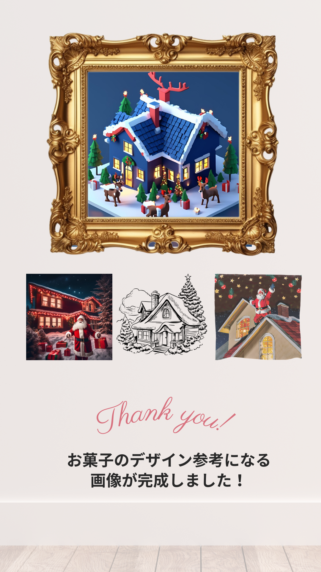 お菓子教室の講師の方からのリクエストでAIで「クリスマス用の立体的なお菓子の家」のデザインアイディア出しをしてみました。