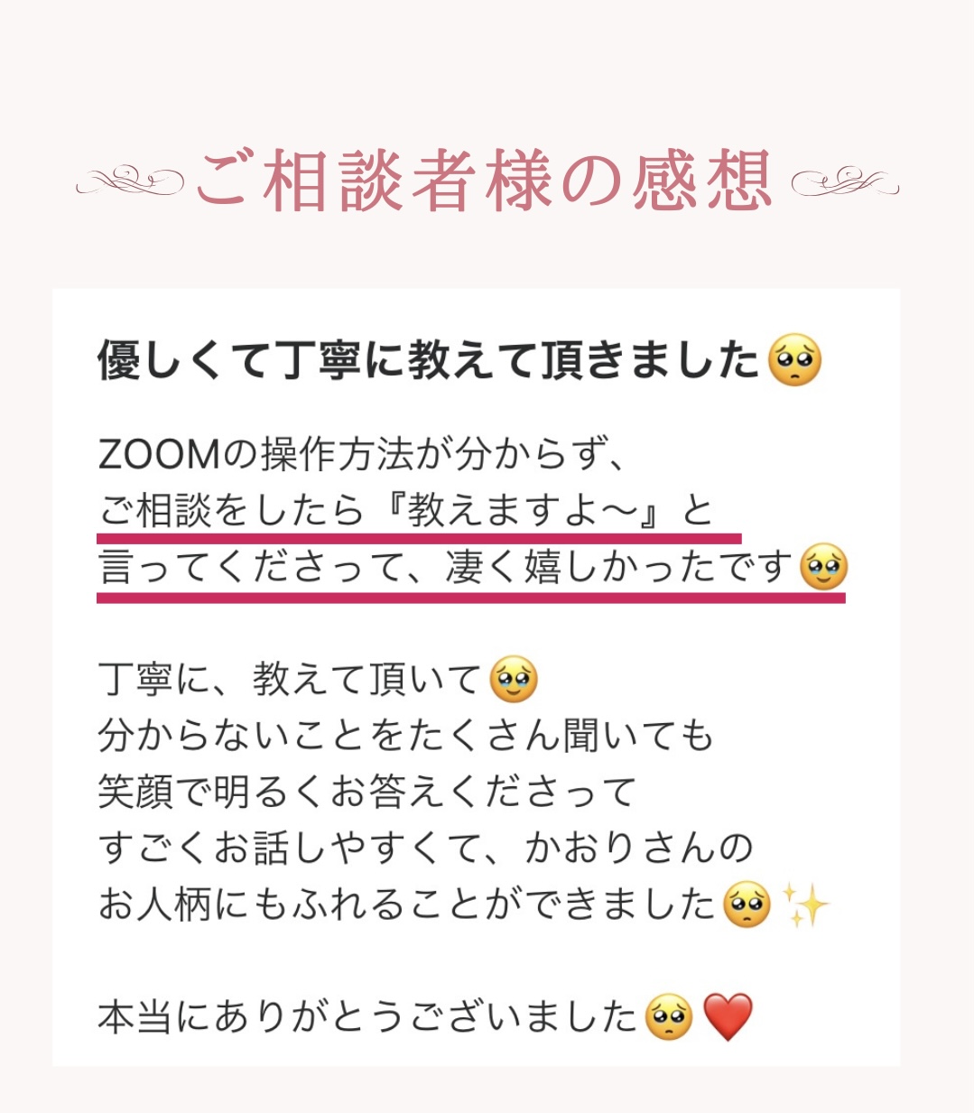 ZOOMの操作方法が分からず、 ご相談をしたら『教えますよ〜』と 言ってくださって、凄く嬉しかったです🥹