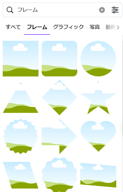 Canvaの「フレーム」とは、画像を特定の形にトリミングする機能のことだよ。