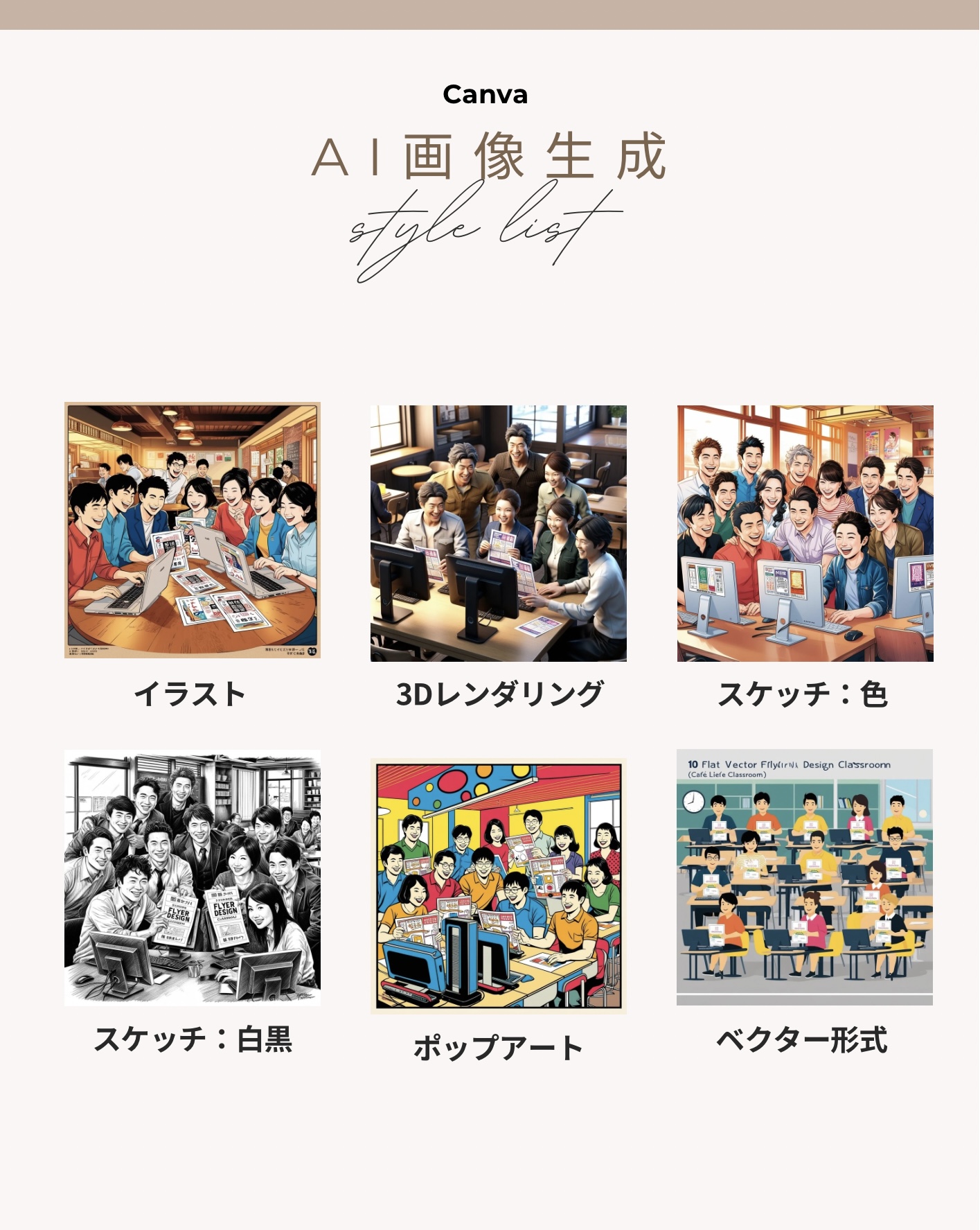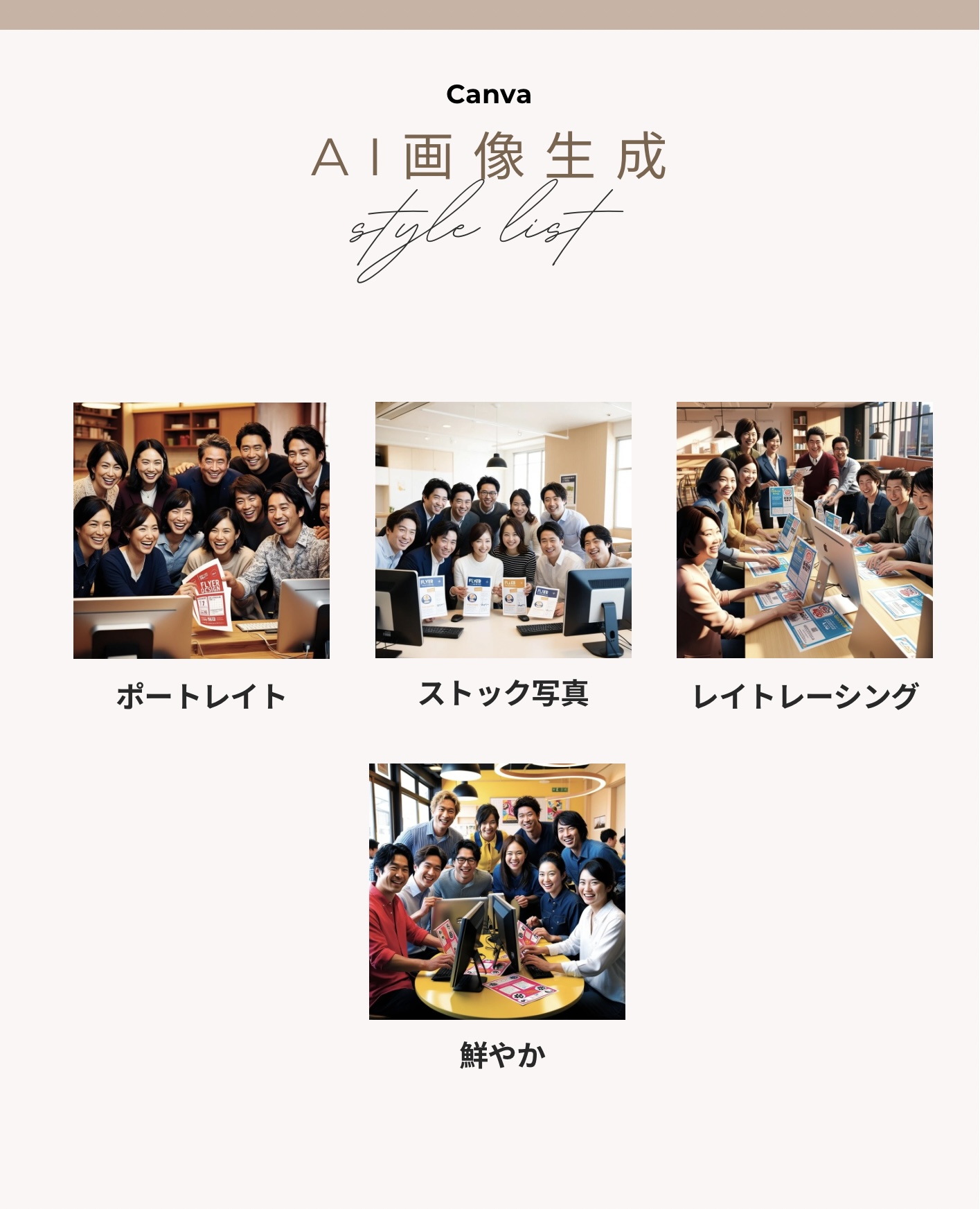 『Canva(キャンバ)』 歴5年、ビジネス現場にもCanvaを導入している私が、CanvaのAI画像生成スタイルをわかりやすく一覧でまとめました。