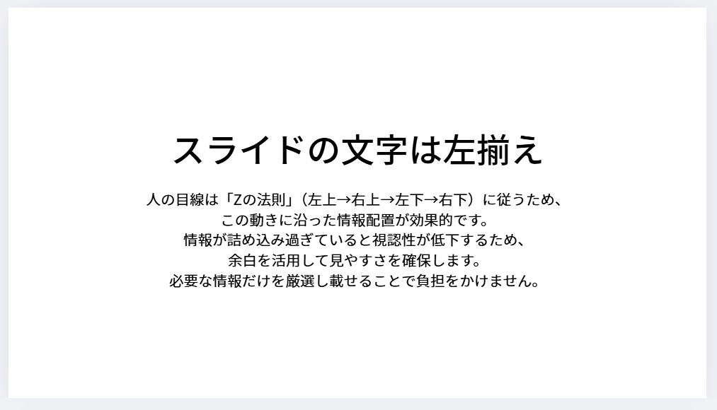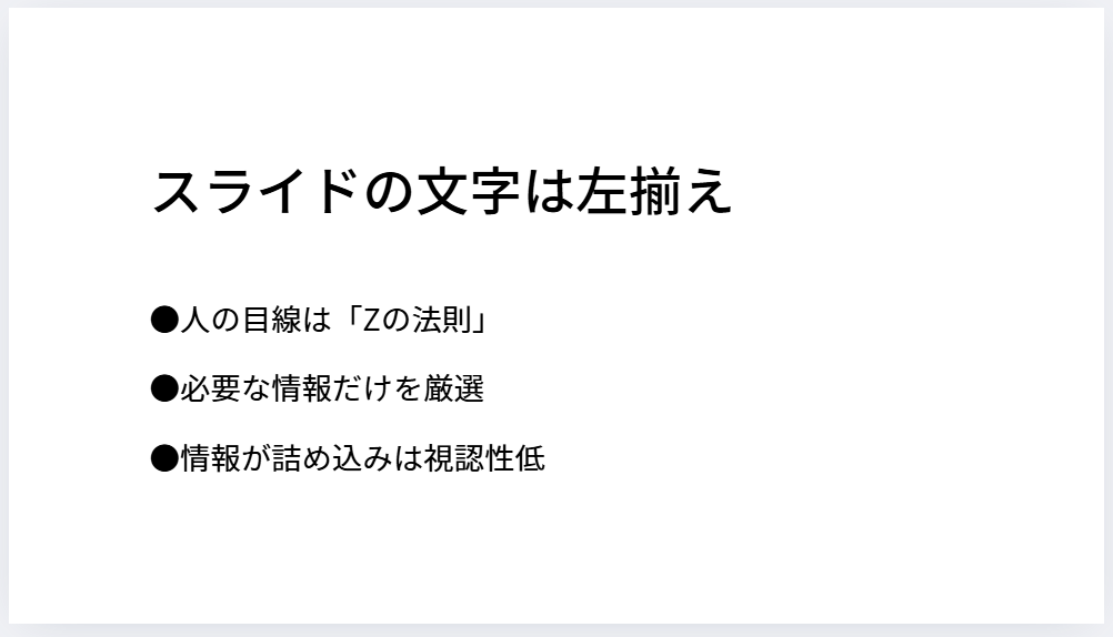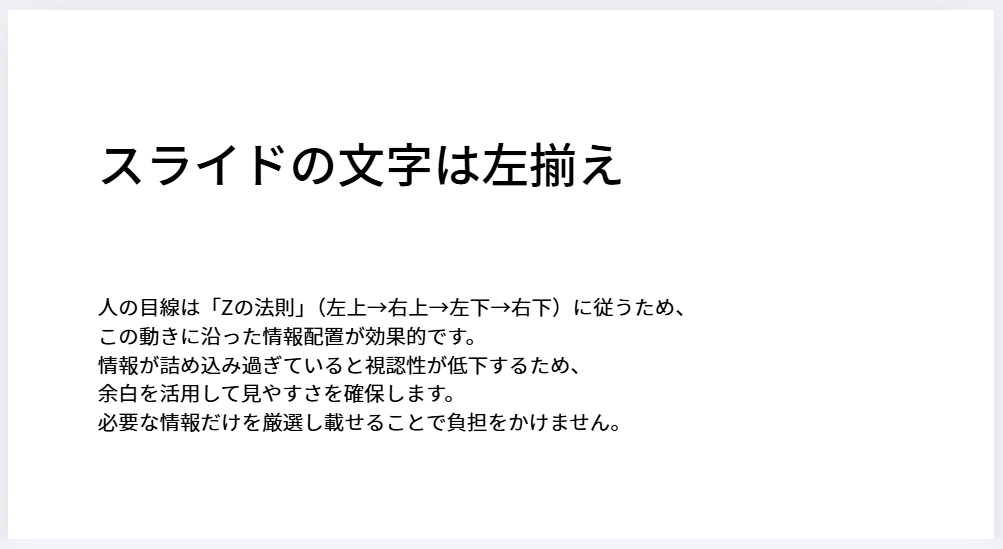 資料はビジュアル面(見て分かる)をサポートするツールを意識してね。