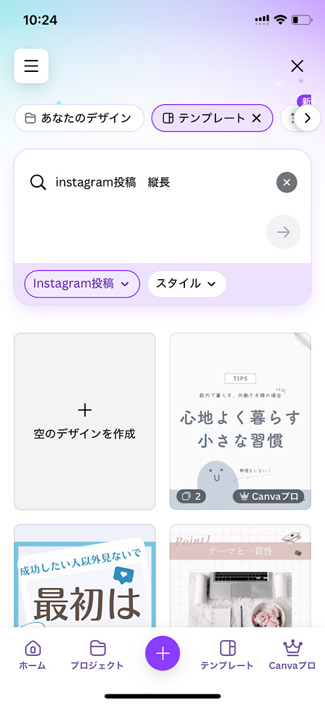 「Instagram投稿」と検索するだけで、投稿画像に最適な「縦長」「正方形」サイズのデザインが一覧表示されます。
