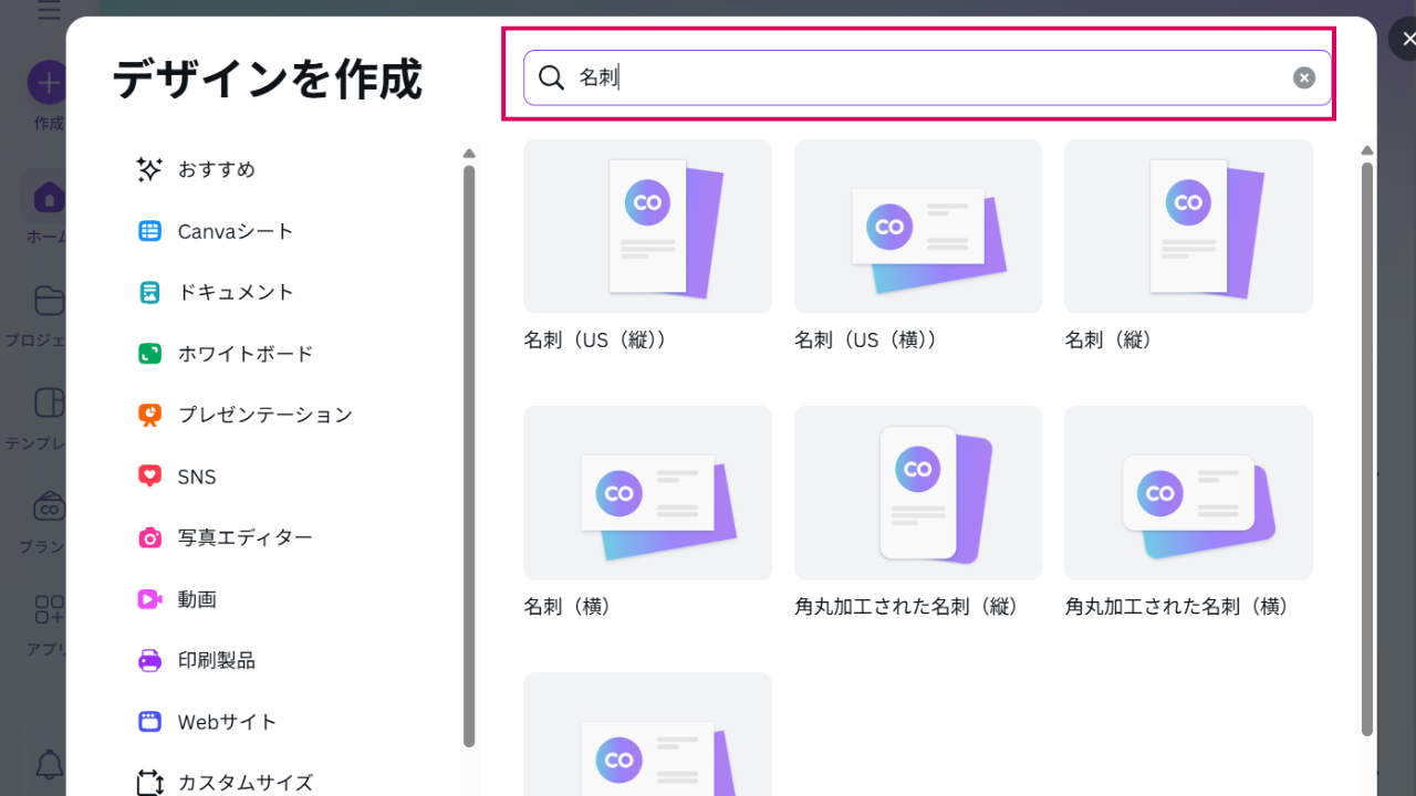 上の検索窓に「名刺」と入力。