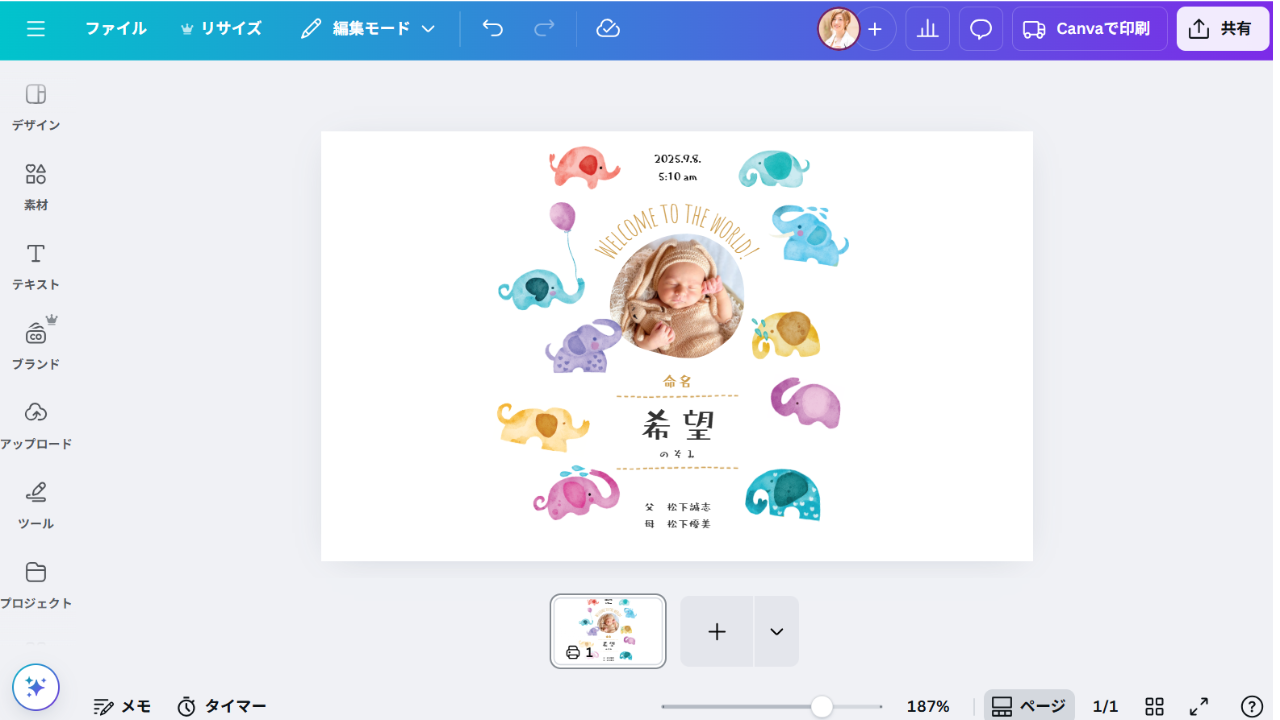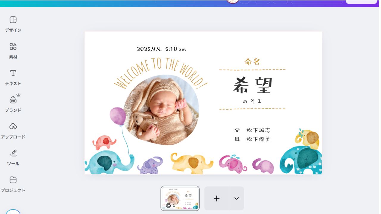 今回はA4の命名書のデザインを「名刺(横)」にサイズ変更していきます。