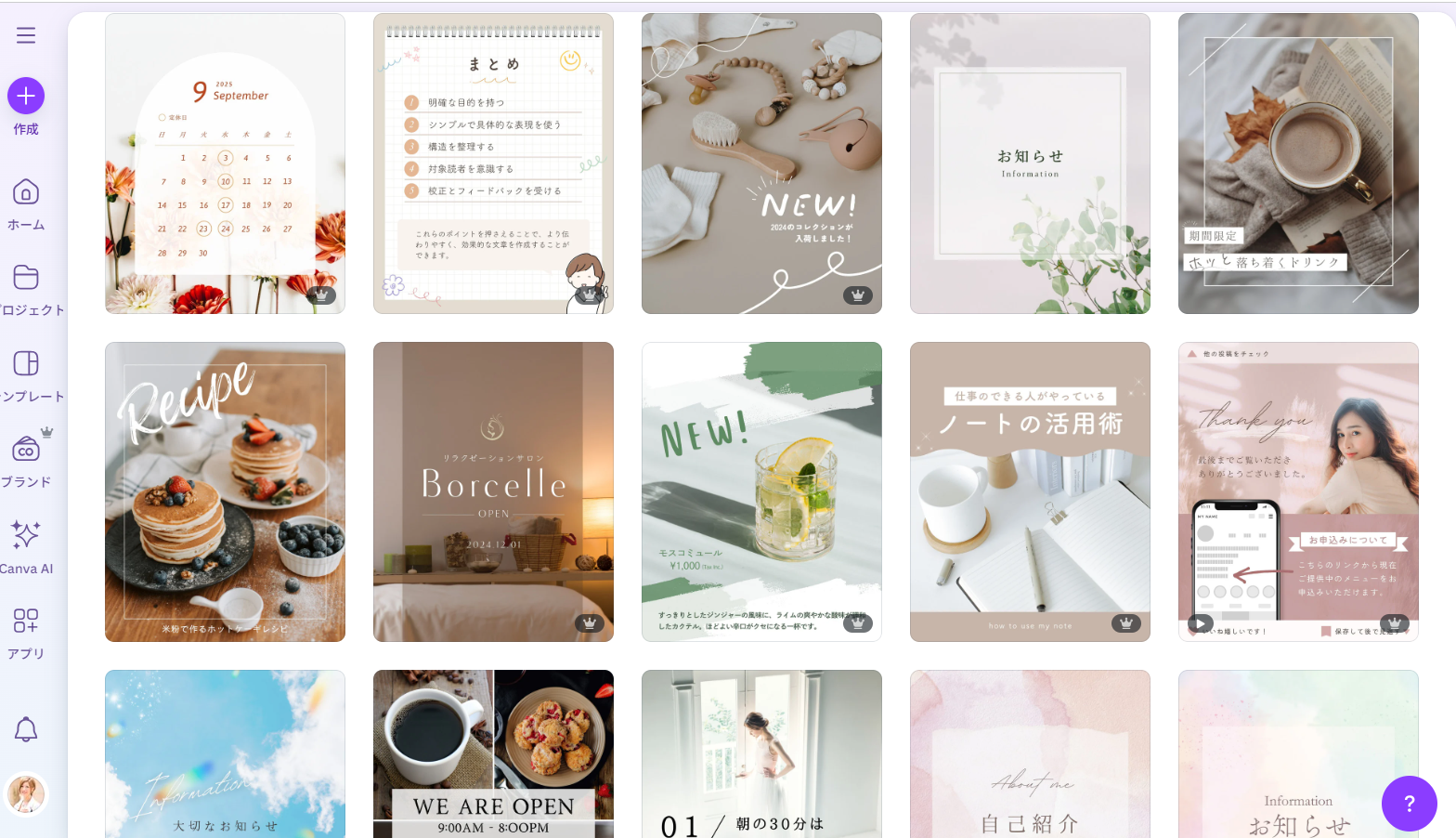 Canvaには、おしゃれなInstagramのテンプレートが豊富に用意されています。
